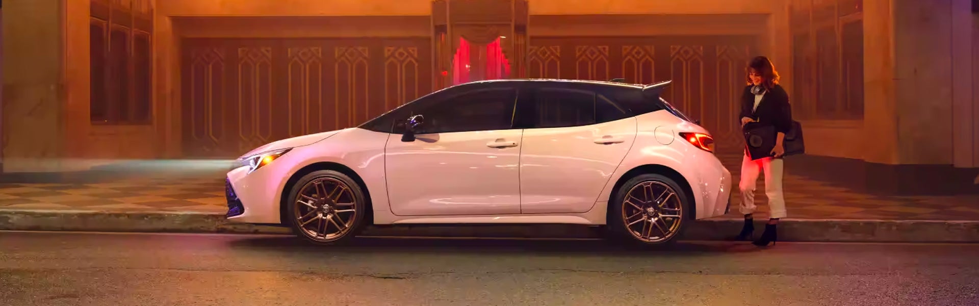 Corolla Hatchback Nightshade has handsome details that turn heads wherever you go. The 18-in. bronze-finished alloy wheels, 2 available two-tone exterior with Midnight Black Metallic roof 3 or all-Midnight Black Metallic exterior, and available accessory vented sport wing give Corolla Hatchback Nightshade’s sporty physique a stylishly enhanced attitude.